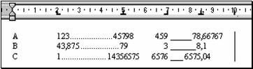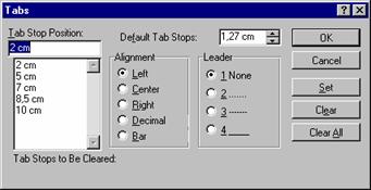 Pentru alinierea textului din document, Word va pune la dispozitie cinci tipuri de tabulatori: aliniati la stânga, centrati, aliniati la dreapta, aliniati zecimal si de tip bara. Caseta de dialog T 747h78h abs va ofera controlul precis asupra pozitiei si a tipului tabulatorilor din documentul dumneavoastra. Mai întâi selectati paragrafele pentru care vreti sa faceti modificarile, apoi selectati Format-Tabs pentru a afisa caseta de dialog Tabs. Introduceti o valoare în caseta Tab Stop Position. Specificati tipul de aliniere în caseta Alignment. De exemplu, în figura de mai jos avem 5 tabulatori, descrisi în Tabel 1: