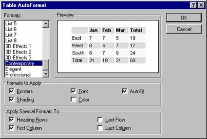 Deoarece formatarea tabelelor poate fi o operatie de durata, Word va pune la dispozitie componenta Table AutoFormat, care poate accelera aceasta operatie. Pentru formatarea automata a unui tabel, executati un clic în interiorul tabelului, apoi selectati Table-Table AutoFormat. Folositi caseta de liste Formats si caseta de previzualizare de lânga aceasta ca sa alegeti formatul care se potriveste cel mai bine cu tabelul pe care vreti sa îl creati.