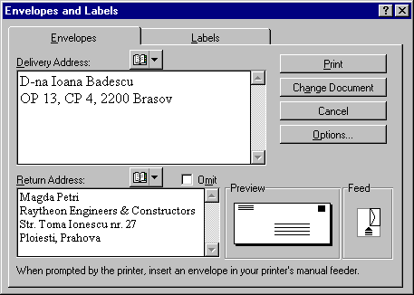 În acest moment puteti sa tipariti plicul, executând un clic pe butonul Print din caseta de dialog Envelopes and Labels sau sa îl adaugati la documentul curent, executând un clic pe butonul Add to Document.