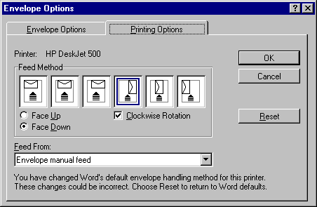 În caseta de dialog Envelope Options puteti seta marimea plicului si corpul de litera pentru adresele destinatarului si ale expeditorului. Folositi eticheta Printing Options ca sa stabili modul în care este alimentata imprimanta dumneavoastra.