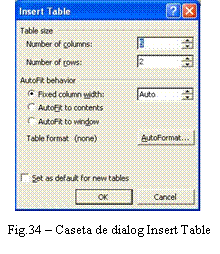 Selectarea din meniul Table a comenzii Insert Table care genereaza afisarea pe ecran a casetei de dialog Insert table, cu structura prezentata în Fig.34.