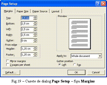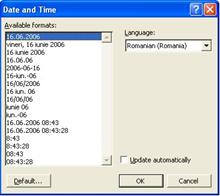 În cadrul ei se ofera mai multe formate de afisare atât pentru data, cât si pentru ora curenta, care pot fi actualizate în mod automat prin validarea casetei Update automatically. Daca se opteaza pentru un anumit format care sa fie aplicat în mod implicit, începând cu documentul din modelul curent, se selecteaza parametrii respectivi si se apasa butonul Default; acesta genereaza afisarea unei casete de dialog în care utilizatorul trebuie sa confirme sau nu setarile facute în vederea aplicarii în mod implicit.