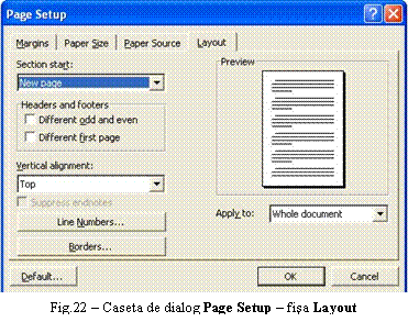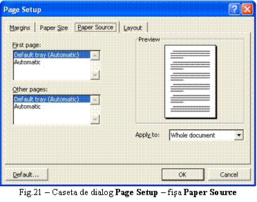 Se poate opta pentru imprimarea întregului document (All pages in range), pagina activa (Current Page), anumite pagini (Pages) sau a unei anumite zone selectate din document (Selection). Documentul se poate imprima într-un exemplar sau mai multe (Number of Copies). În cazul imprimarii în mai multe exemplare se poate alege imprimarea exemplarelor unul dupa altul (Collate) sau în acelasi timp (de exemplu pentru listarea unui document în trei exemplare se listeaza pagina 1 în trei exemplare, apoi pagina 2 în trei exemplare, etc.). Din optiunea Print se poate restrictiona imprimarea numai pentru paginile pare (Even pages) sau paginile impare (Odd pages). Daca nu se doreste imprimarea documentului, ci numai a anumitor caracteristiciale acestuia se utilizeaza optiunea Print what, fiind puse la dispozitie optiuni pentru imprimarea comentariilor (Comments), proprietatile documentului (Document properties), stilurilor definite în document (Styles), etc.