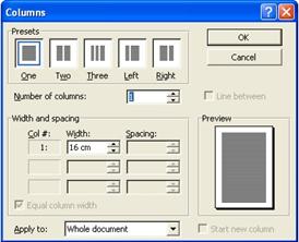 Numarul de coloane stabilit la un moment dat se poate modifica în functie de dorintele utilizatorului prin simpla selectie a sectiunii asupra careia actioneaza noua formatare si parcurgerea acelorasi etape prezentate la crearea propriu-zisa a coloanelor text. Spre exemplu, revenirea la o singura coloana se face prin selectia textului respectiv si alegerea optiunii One din caseta de dialog Columns (sau prin butonul Columns din bara cu instrumente standard, în cadrul caruia se acopera o singura coloana din grila afisata).
