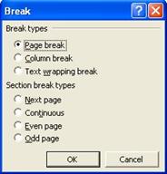 Crearea unei sectiuni se realizeaza prin pozitionarea cursorului în locul în care dorim sa înceapa o noua sectiune si selectarea din meniul Insert a optiunii Break, de unde se alege ulterior tipul întreruperii.