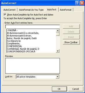 pentru definirea altor intrari în AutoCorrect, se repeta setul de operatii prezentate anterior;