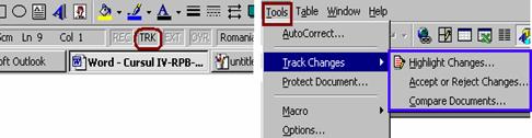 Selecteza Tools => Track Changes => Highlight Changes din bara de meniuri, sau poti sa executi un dublu-clic pe butonul Track Changes (Urmarirea modificarilor) de pe bara de stare (este etichetat TRK) sau sa folosesti combinatia de taste Ctrl+Shift+E. Butonul TRK devine activ.