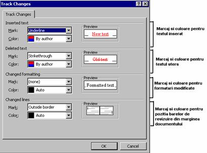 Nota: Daca nu ai stabilit cu persoanele care fac modificari sa foloseasca o anumita culoare, ar fi bine sa nu modifici optiunea By Author (Dupa autor) din sectiunile Inserted Text (Text inserat) si Deleted text (Text sters), pentru a sti cine si ce a modificat.