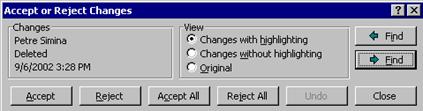 Odata ce un document a fost configurat ca sa urmareasca modificarile facute in el, poti sa revezi schimbarile si sa decizi daca vrei sa le accepti sau daca nu. Folosesti secventa: Tools => Track Changes => Accept Or Reject Changes