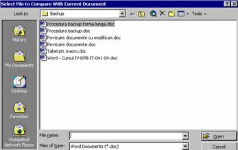 Avand deschisa copia master a documentului, selecteaza meniul Tools, submeniul Track Changes, comanda Compare Documents (Compara documente). Editorul Word deschide caseta de dialog Select File to Compare With Current Document (Selectati fisierul de comparat cu documentul curent). Cu ajutorul acesteia vei selecta fisierul cu care faci comparatia, cel in care s-au facut modificarile.