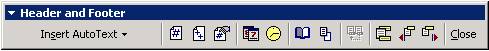 Inserarea textului sau a altor elemente într-un antet sau un subsol se poate realiza folosind comanda Header and Footer din meniul View View\Header and Footer). În urma acestei comenzi editorul va trece automat în modul de vizualizare Print Layout va afisa bara de unelte Header and Footer care este prezentata în imaginea urmatoare si pozitioneaza punctul de inserare în antetul paginii curente. Antetul sau subsolul este evidentiat printr-o zona trasata cu linie punctata, iar deasupra este scris Header (antet) sau Footer (subsol). Daca documentul contine antete si subsoluri diferite acest lucru este evidentiat în acest text.