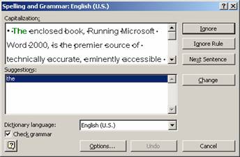 In locul unei liste de cuvinte corecte din punct de vedere ortografic, zona Suggestions: prezinta una sau mai multe versiuni ale textului, corecte din punct de vedere gramatical. Ca si in cazul erorilor ortografice, poti edita textul in zona in care este afisata eroarea sau poti alege una din variantele sugerate si apoi sa apesi butonul Change. Butonul Ignore Rule are ca efect ignorarea regulii respective in tot documentul, deci este posibil ca programul sa ignore si alte greseli.