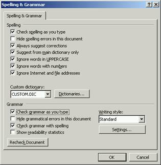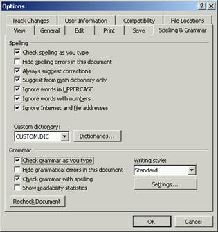 n Selectezi comanda Options… din meniul Tools, apoi executi clic pe fisa cu optiuni Spelling & Grammar. Vei obtine o caseta de dialog ca in imaginea urmatoare.