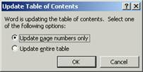 n Update page numbers only (actualizeaza doar numarul paginilor) permite actualizarea numarului paginilor fara a actualiza si continutul cuprinsului. Este utila aceasta optiune in cazul in care ai facut modificari de continut in interiorul cuprinsului.
