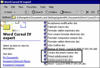 Īn urma operatiei de salvare a documentului master Word-ul a salvat fiecare subdocument ca fisier separat īn acelasi dosar, dāndu-i numele scris ca titlu īn momentul crearii. Acesta este unul din motivele pentru care la punctul 4 ti s-a spus sa introduci titlul cu stilul Heading 1.