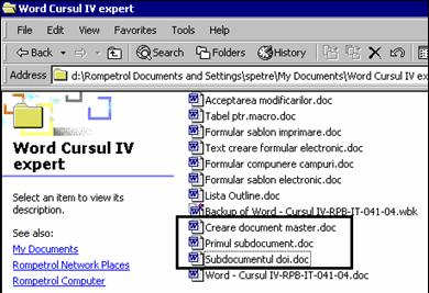 In urma operatiei de salvare a documentului master Word-ul a salvat fiecare subdocument ca fisier separat in acelasi dosar, dandu-i numele scris ca titlu in momentul crearii. Acesta este unul din motivele pentru care la punctul 4 ti s-a spus sa introduci titlul cu stilul Heading 1.