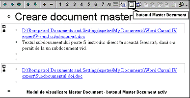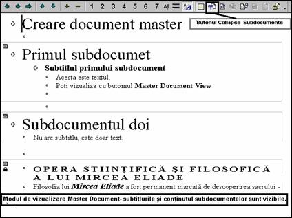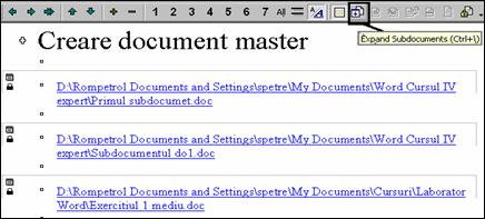 In urma actionarii butonului Collapse Subdocuments fiecare subdocument este redus la o hiperlegatura; numele butonului se schimba in Expand Subdocuments (Extindere subdocumente).