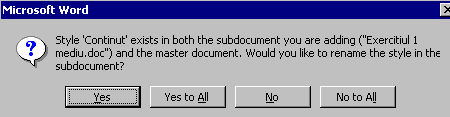 Caseta de avertizare te anunta ca :”Stilul <nume> exista si in subdocumentul pe care il adaugi si in documentul master. Doresti sa redenumesti stilul folosit in subdocument?”. In exemplul dat numele stilului este „Continut”. Iata variantele de raspuns: