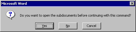 In cazul in care subdocumentele din documentul master sunt inhibate (sunt prezentate ca hiperlegaturi), comanda de previzualizare sau tiparire are ca efect aparitia unei casete de interogare prin care ti se cere sa precizezi daca doresti sau nu deschiderea subdocumentelor inainte de executarea comenzii propriu-zise.