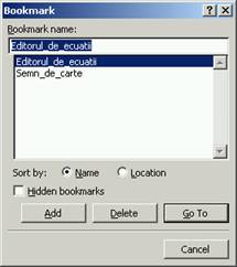 Nota. 1. Semnele de carte pot fi sortate dupa numele pe care l-ai dat (Name) sau dupa pozitia in document (Location), in functie de optiunea selectata in zona Sort by: