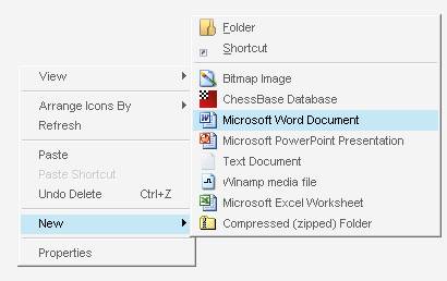 2.2. De pe Desktop sau intr-o fereastra My Computer sau Windows Explorer dupa ce se stabileste locatia fisierului Word,se activeaza meniul rapid si se selecteaza optiunea New.Din lista care apare se selecteaza New Microsoft Word Document.Fisierul va avea extensia .doc(fig.2).