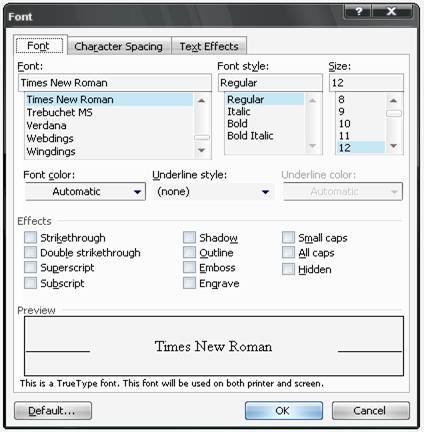 Pentru stabilirea fontului dorit se foloseste meniul Format,comanda Font (fig.4).Fereastra Font este organizata pe trei cadre de pagina : Font,Character Spacing, Text Effects.Pentru formatarea caracterelor se folosesc optiunile din pagina Font.