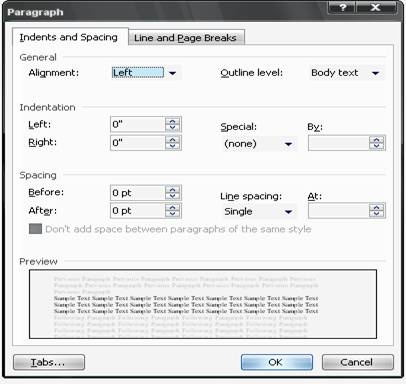 Pentru formatarea unui paragraf se foloseste meniul Format,comanda Paragraph, prin care se deschide fereastra Paragraph organizata pe doua cadre de pagina ce permit alegerea optiunilor referitoare la indentarea si spatierea intre rânduri si la modul de întrerupere a rândurilor si a paginilor(fig. 5).