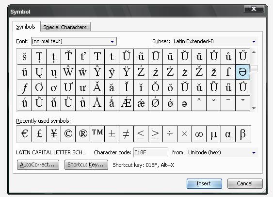 Simbolurile si caracterele speciale care nu sunt pe tastatura pot fi utilizate în editarea textelor, ele aparând atât pe ecran, cât si la tiparirea documentelor la imprimanta.Este si cazul folosirii de caractere romanesti.Deoarece diacriticile specifice limbii române nu apar pe tastaturile folosite în prezent, ele trebuie inserate sub forma de simboluri.Pentru inserarea de simboluri se foloseste meniul Insert, comanda Symbol.