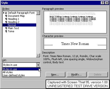 Pentru inceput se poate stabili din zona List care stiluri sa fie vizibile. Optiunea Styles in use afiseaza doar stilurile aplicate sau modificate, ori stilurile create de utilizator pentru documentul activ. Optiunea All styles afiseaza toate stilurile existente, iar optiunea User-defined styles afiseaza doar stilurile create pentru documentul activ.