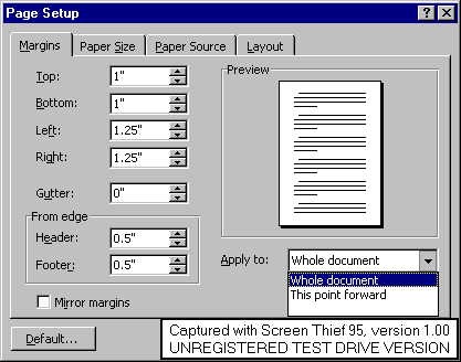 Modificarea marginilor se face alegand sectiunea Margins si introducand in zonele Top, Bottom, Left, Right, valorile dorite pentru marginea de sus, jos, stanga respectiv dreapta a paginii. Unitatile de masura implicite sunt in inch (1 inch=2.54 cm). In zona From edge se alege distanta fata de marginea paginii la care dorim sa apara eventualele antete, respectiv note de subsol. In mod normal aceste valori sunt mai mici decat valorile pantru marginile de sus si jos a paginii, dar daca valorile introduse sunt mai mari (si deci antetul respectiv nota de subsol ar intra in corpul paginii), Word va tipari textul din pagina dedesuptul antetului, respectiv deasupra notei de subsol. Domeniul de aplicare a modificarii respective se poate alege din zona Apply to: intregului document sau doar de la punctul unde se afla cursorul in continuare.