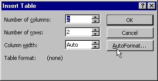 Insistam asupra acestui mod de a crea un tabel, deoarece este modul ce prezinta cele mai multe optiuni. Se provoaca aparitia ferestrei de dialog Insert Table. din meniul Table.