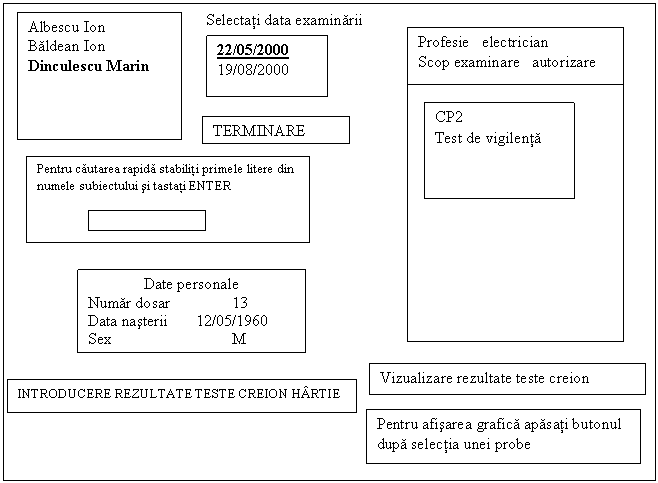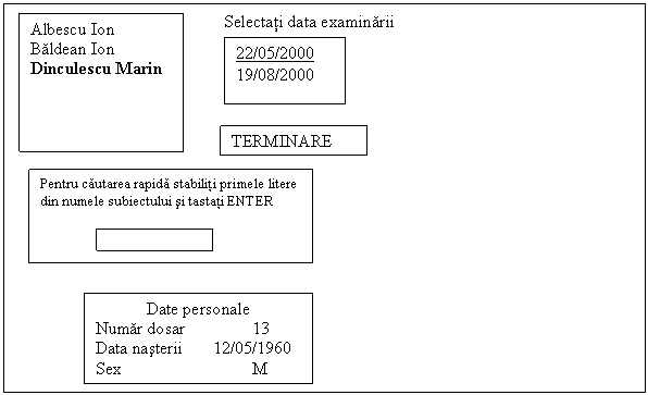 In acest ecran se afa un catalog cu toti subiectii īn ordine alfabetica. Daca se doreste vizualizarea rezultatelor unui subiect se apasa cu mousul pe numele subiectului respectiv, trecāndu-se la ecranul E8 unde se afiseaza datele personale ale subiectului si datele de examinare.