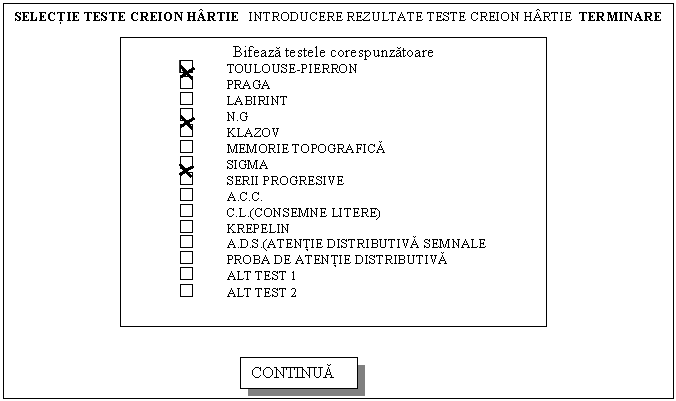 Daca se apasa cu mousul pe optiunea "SELECŢIE TESTE CREION HĂRTIE" se trece la ecranul urmator, unde se bifeaza testele pentru care se doreste introducerea de date.