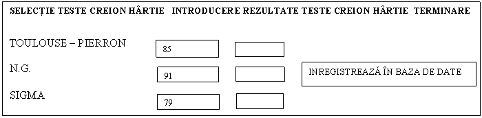 In cazul īn care se doreste introducerea de date pentru testele creion-hārtie atunci se apasa cu dublu clik pe optiunea "INTRODUCERE REZULTATE TESTE CREION HĂRTIE" din stānga-jos a ecranului E9 si se trece la ecranul urmator: