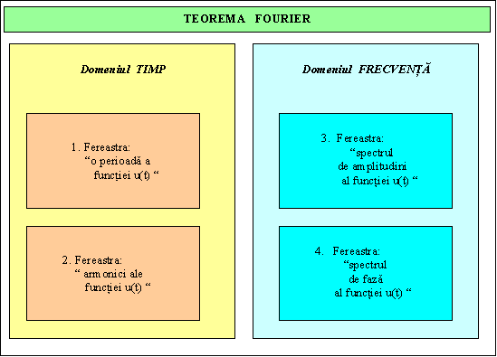Pentru intelegerea profunda a acestei realitati fizice, este extrem de util sa apara in cadrul aceleiasi ferestre atat reprezentarea in domeniul a functiei timp cat reprezentarea in domeniul frecventa a functiei analizate. Pentru aceasta este indicat a fi realizat un GUI de forma celui din figura 1.