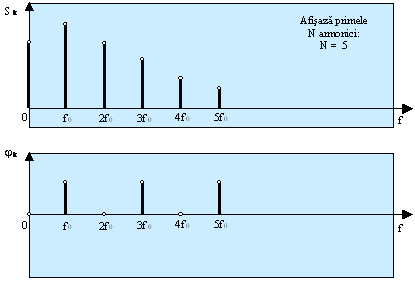 Aceasta fereastra afiseaza valoarea amplitudinii primelor N armonici din spectrul semnalului u(t). Afisarea amplitudinii unei sinusoide se face sub forma unui segment avand lungimea proportionala cu amplitudinea sinusoidei, plasat vertical in dreptul frecventei sinusoidei.