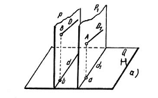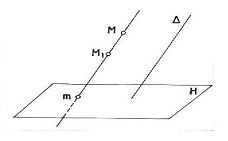 Fie dreptele D si D1 paralele, continute in planele paralele P si P1 perpendiculare pe planul H. Planele P si P1 intersecteaza planul H dupa doua drepte paralele.