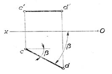 Unghiul dintre cd si axa Ox apare nedeformat si este unghiul β pe care-l face orizontale cu planul vertical de proiectie.