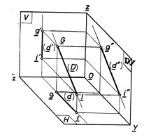 c. Dreapta de profil. Fie dreapta de profil GI, adica dreapta paralela cu planul lateral de proiectie .In cazul acestei drepte este necesar sa se introduca si al treilea plan de proiectie (W), deci de reprezentat in triedrul dreapta.Planul proiectant al dreptei, fata de planul orizontal H si fata de planul vertical V, este identic si paralel cu planul de proiectie W. Deci rezulta ca proiectiile orizontala gi si verticala g'i' sunt perpendiculare pe axa Ox. In ce priveste proiectia laterala g"i" ea poate lua orice pozitie.
