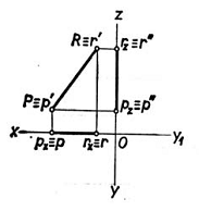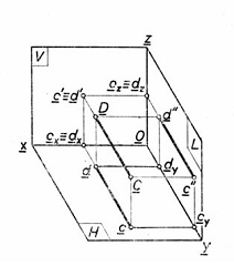 In epura dreptei de capat proiectia orizontala cd este paralela cu axa secundara de proiectie Oy(, iar proiectia laterala c"d" este paralela cu axa principala )Ox(, proiectia verticala aparand complet deformata c' ≡ d'.