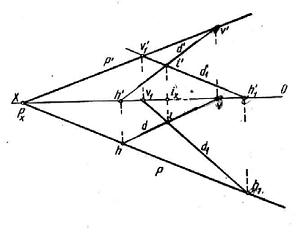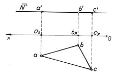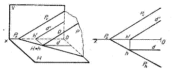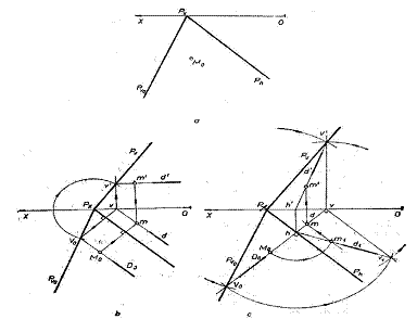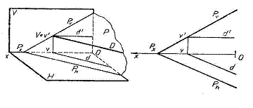 Din v se ridica o perpendiculara pe axa Ox, iar din Px, cu raza PxV0, se descrie un arc de cerc care intersecteaza linia de ordine in punctul v', urma verticala a dreptei de nivel. Unind punctul Px cu v' se obtine urma verticala P' a planului, iar din v si v' se traseaza proiectiile d si d' ale dreptei de nivel.