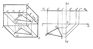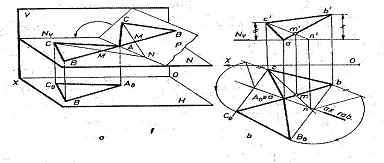 Pentru a determina adevarata marime a triunghiului ABC,e rabate planul triunghiului pe planul de nivel ce trece prin punctul A si deci corespunde cu propriul sau rabatut. Axa de rabatere AN se determina, utilizand dreapta CM, continuta de plan. Pentru constructia triunghiurilor de rabatere se masoara cotele pana la planul de nivel.