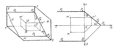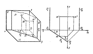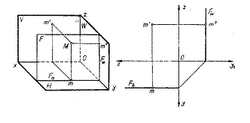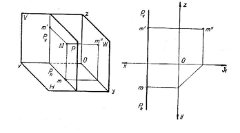 Fie un punct din spatiu, MЄI, care se proiecteaza ortogonal pe cele trei plane de proiectie. Imaginile lui pe [H], [V] si [W] se noteaza cu m , m' , m" si se numesc proiectia orizontala, verticala si respectiv laterala. Proiectantele punctului M, determina plane perpendiculare pe planele de proiectie si care intersecteaza axele reperului in punctele mx , my, mz .