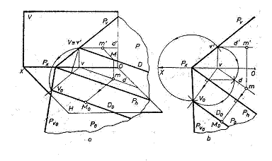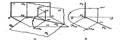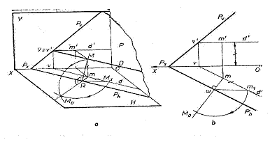 Se considera punctul M0, continut de planul P, in pozitie rabatuta pe planul orizontal de roiectiePentru a construi proiectiile punctului M, se considera prin punct o dreapta de nivel D0, in pozitie rabatuta, avand urma verticala V0. din V0 se duce o perpendiculara pe urma orizontala P, care intersecteaza axa Ox in punctul v, proiectia orizontala a urmei verticale.