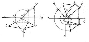 Pentru a obtine adevarata marime a triunghiului ABC continut in [P] printr-o rabatere pe planul vertical de proiectie se foloseste urma orizontala P a carei rabatere este P0 ┴ P'. Rabaterea A0 a punctului A0(a,a') se gaseste la intersectia dintre perpendiculara dusa in a' pe P1' cu perpendiculara dusa din a1 pe P0 (ax a =Px a1= a'A0). Rabaterea celorlalte puncte se obtin in mod analog.