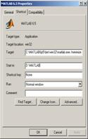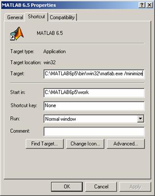 Tastati în câmpul Target, dupa calea catre "matlab.exe", una sau mai multe optiuni de lansare, cum ar fi optiunea /minimize: