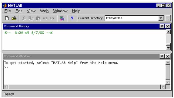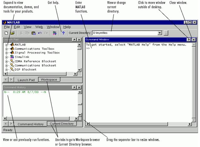 Fereastra principala MATLAB (MATLAB Desktop). Dupa lansarea programului MATLAB, în prim plan apare fereastra principala MATLAB, ce contine unelte de control al directoarelor, fisierelor, variabilelor si al aplicatiilor asociate MATLAB-ului.