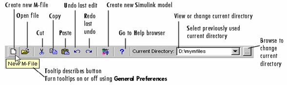 MATLAB Desktop Toolbar permite accesul usor la uneltele clasice MATLAB. Ţinând cursorul deasupra unui buton, o indicatie ajutatoare descriind unealta, va apare într-o casuta galbena. Unele ferestre au propriul lor toolbar inclus în sistemul de afisare.