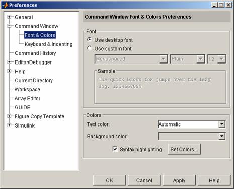 Proprietatile specifice ferestrei Command Window permit modificarea formatului de afisare a valorilor numerice, setarea automata a ecoului în cadrul unei sesiuni MATLAB, specificarea fontului, a stilului, a dimensiunii literelor, setarea culorilor folosite pentru sublinierea instructiunilor specifice etc. Pentru afisarea cutiei de dialog cu proprietatile ferestrei Command Window, selectati Preferences din meniul File al MATLAB Desktop. Cutia de dialog se deschide permitând modificarea proprietatilor ferestrei Command Window.