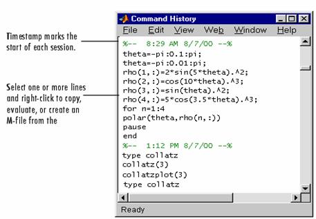Afisarea functiilor în Command History Window. Lista de comenzi afisate în Command History include atât functii din sesiunea curenta cât si functii din sesiuni anterioare. Ora si data pentru fiecare sesiune apare în partea superioara a listei de functii aferente acelei sesiuni de lucru. Folositi scroll-bar-ul sau sagetile up si down pentru a naviga în fereastra Command History. Fisierul specific uneltei Command History este history.m. Tastati prefdir în Command Window pentru a vedea locatia acestui fisier. Fisierul history.m este încarcat odata cu lansarea programului MATLAB si suprascris când iesiti din MATLAB.